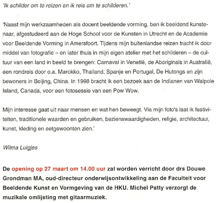 De landschappen die Wilma Luigjes toont hebben een lyrisch karakter. Wilma houdt van reizen. Zij was onder meer in Thailand, China en Australië. De uitingen van cultuur in kleding, dans en