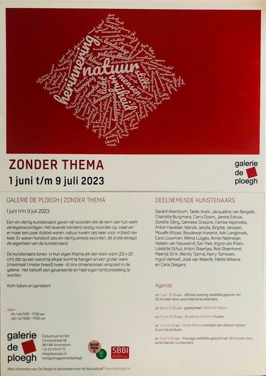 De 5 thema's die getoond zullen gaan worden in De Zonnehof zijn materiekunst/mechanische kunst, architectuur/interieur, landschap, portret/figuur en abstract.